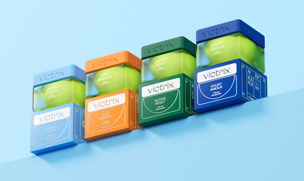 VICTRIX — дизайн линейки упаковки пищевых добавок для теннисистов, где корт встречается с мячом: квадратный прозрачный флакон будто площадка, а внутри — светящийся лаймовый «мяч», символ энергии и пользы. Каждая категория считывается по цвету одного из турниров Большого шлема.