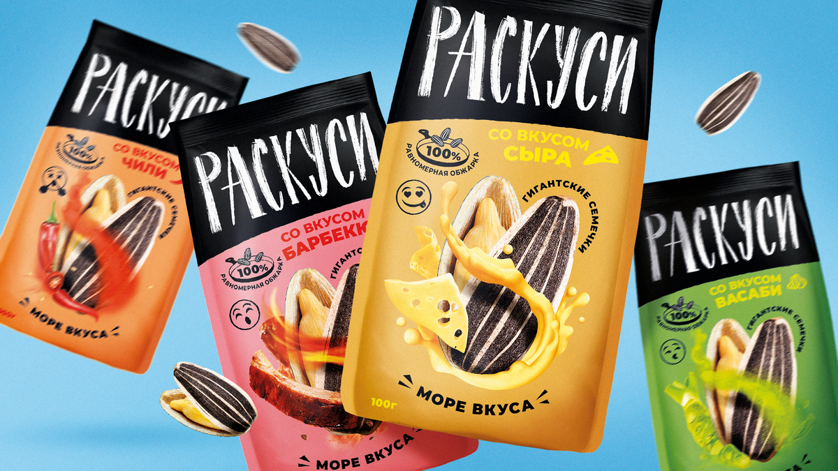 Чтобы дифференцировать семечки «Раскуси» среди более традиционных конкурентов, было решено придать им характерный, дерзкий имидж. Название «Раскуси» на упаковке выполнено шрифтом, напоминающим краску или мел, что делает бренд-зону более заметной и создает эффект «call to action», становясь элементом коммуникации.