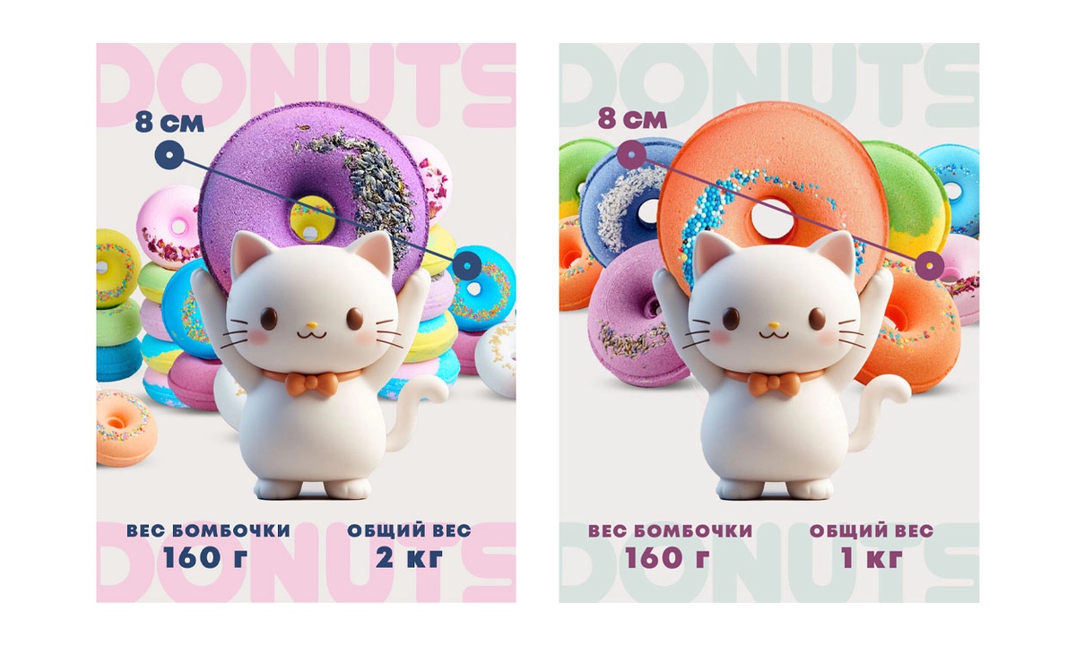 Дизайн карточек выполнен в ярком, игривом стиле с элементами кавай-эстетики (японской «милой» графики) и гастрономической тематики (бомбочки стилизованы под пончики). Это создаёт ассоциацию с радостью, праздником и беззаботным отдыхом.